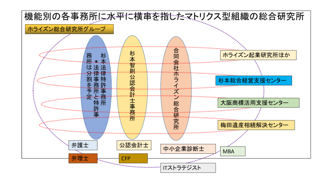 ホライズン総合研究所は、合同会社ホライズン総合研究所、杉本法律特許事務所、杉本智則公認会計士事務所を総合した事業体を指します、登録や登記の関係上、法律上の組織の実体は上記となりますが、昨今、外部環境の変化が目まぐるしく、法律の専門家や、会計の専門家だけでは解決できない問題も増えています。そこでホライズン総合研究所は、そうした複数の分野にまたがる複雑な課題を解決する
